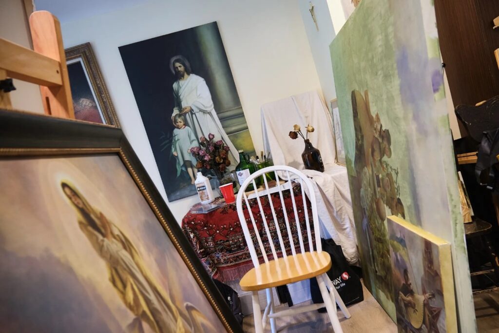 In het atelier van ikonograaf en vluchteling Serhii Kolodka in de Oekraïens-katholieke kathedraal Holy Eucharist in New Westminster, British Columbia, Canada, kun je alleen maar staan. Schilderijen staan of hangen op een rij langs de muren en leunen tegen ezels op de vloer. Landelijke volkskunst hangt naast historische reproducties en religieuze schilderijen. Kolodka is qua opleiding geen traditionele iconograaf en zijn gebruik van olieverf – in tegenstelling tot ei- tempera of andere traditionele mediums – is duidelijk te zien in de ingewikkelde afbeeldingen die de kamer bevolken.