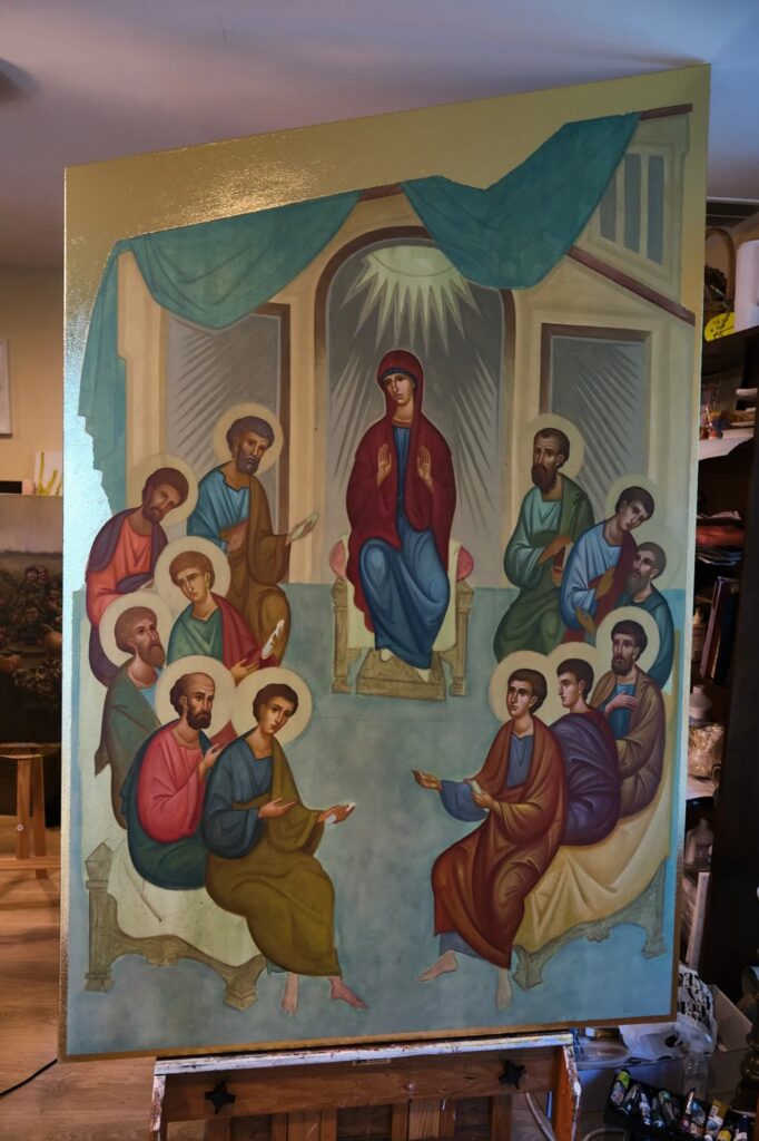 Vorig jaar druppelde er af en toe een contract voor een portret binnen, maar heden legt Kolodka de laatste hand aan zijn eerste grote iconografische project voor een plaatselijke parochie, een paar bij elkaar passende panelen met afbeeldingen van Pinksteren en de doop van Christus in de Jordaan voor de Holy Spirit Church in New Westminster. De panelen zouden volgens plan op 9 juli geïnstalleerd worden.
