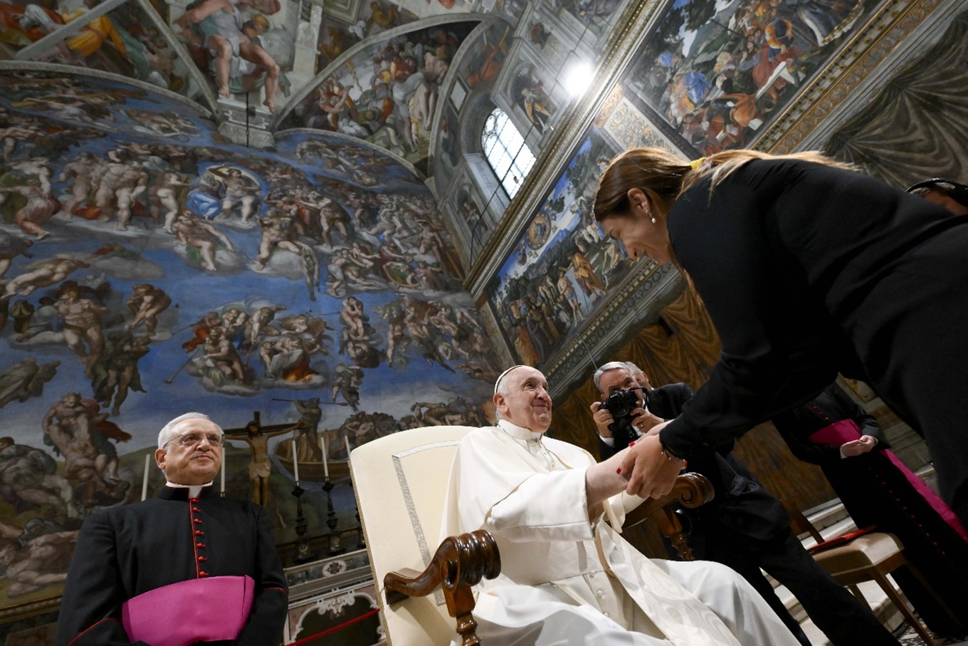 Paus Franciscus sprak ongeveer 200 vooraanstaande kunstenaars en andere creatieve mensen uit meer dan 30 landen toe in de Sixtijnse Kapel op 23 juni 2023. Krediet: Vaticaan Media