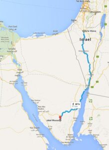 Volgens Google is de afstand van Be’er-Sheva naar de berg Sinaï 417 km of 260 mijl.