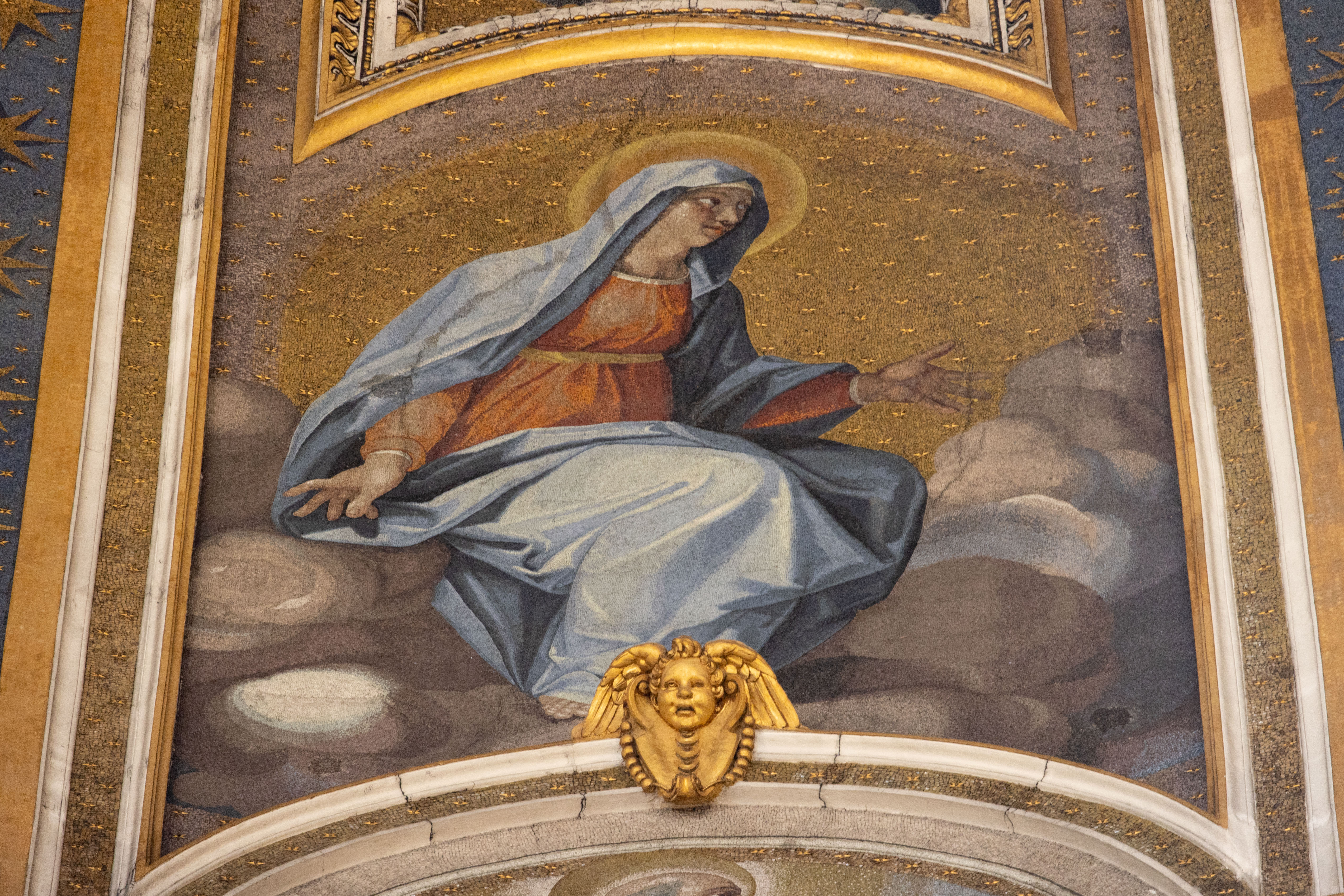 14 augustus 2025 – EWTN’s ‘Crushed by the Woman’ behandelt protestantse vragen over Onze Lieve Vrouw. De mozaïeken die het interieur van de koepel van de Sint-Pietersbasiliek versieren tonen de Heilige Maagd Maria naast Christus de Verlosser en de Apostelen. Foto: Daniel Ibañez/CNA
