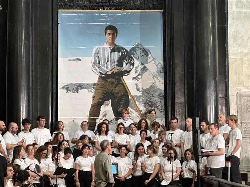 5 juli 2025 – Een koor poseert voor een afbeelding van Pier Giorgio Frassati tijdens een viering van het eeuwfeest van zijn dood, Turijn, Italië, vrijdag 4 juli 2025 / Foto: Courtney Mares/CNA
