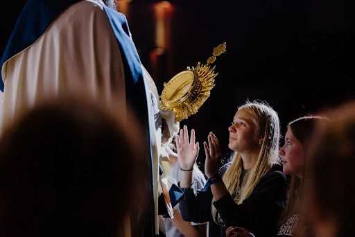 13 juli 2025 – Een middelbare scholier vereert de Eucharistie tijdens de aanbidding op woensdagavond in 2024 op de hoofdlocatie van Damascus, Centerburg, Ohio. Foto: Foto met dank aan Damascus Media Staff