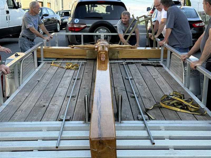 1 juli 2025 – Een 20 voet, 800 pond kruis dat bijna 50 Europese hoofdsteden heeft bezocht, bekend als het “Kruis van Dankbaarheid,” is onlangs verwelkomd door een Oekraïens Grieks-katholieke kerk in Shenandoah, Pennsylvania, de eerste parochie van het Grieks-katholieke ritus in Amerika. / Met dank aan: St. Michael de Aartsengel Oekraïens Grieks-katholieke Kerk