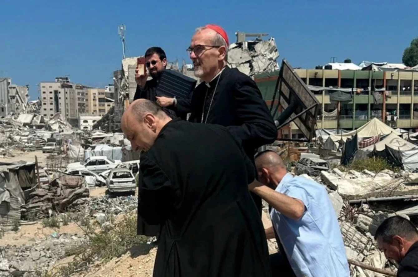 18 augustus 2025 – Kardinaal Pierbattista Pizzaballa bezoekt het door oorlog geteisterde gebied rond de Heilige Familiekerk met de pastoor van de parochie in Gaza, pater Gabriel Romanelli. Foto: met dank aan het Latijnse Patriarchaat van Jeruzalem