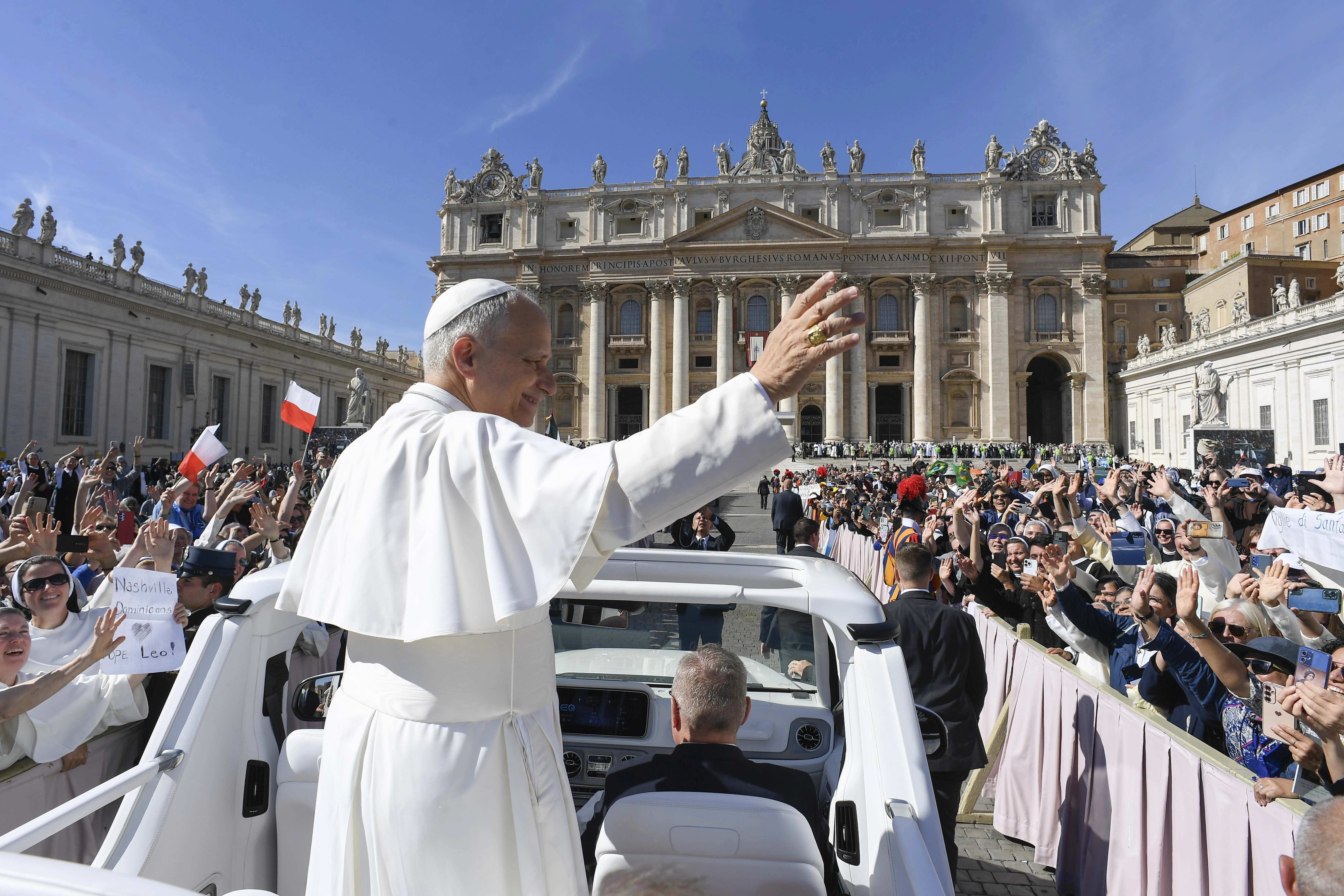 9 oktober 2025 – Paus Leo XIV begroet de aanwezigen bij de Mis voor het Jubileum van het Geëngageerde Leven op het Sint-Pietersplein in het Vaticaan. Foto: Vatican Media