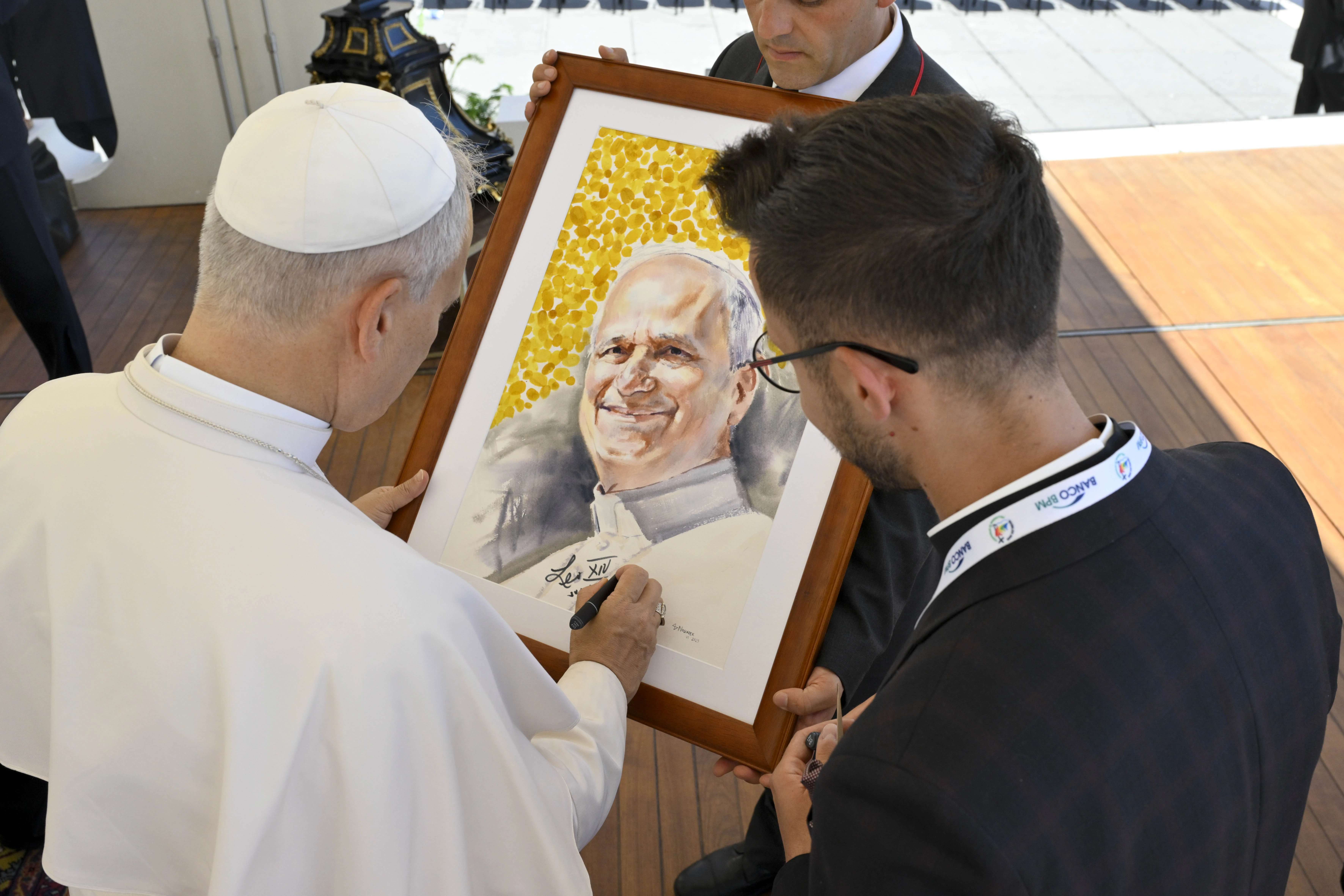 30 juli 2025 – Paus Leo XIV signeert een portret van zichzelf voor een pelgrim tijdens zijn algemene audiëntie op 30 juli 2025, op het Sint-Pietersplein in Vaticaanstad. Foto: Vatican Media