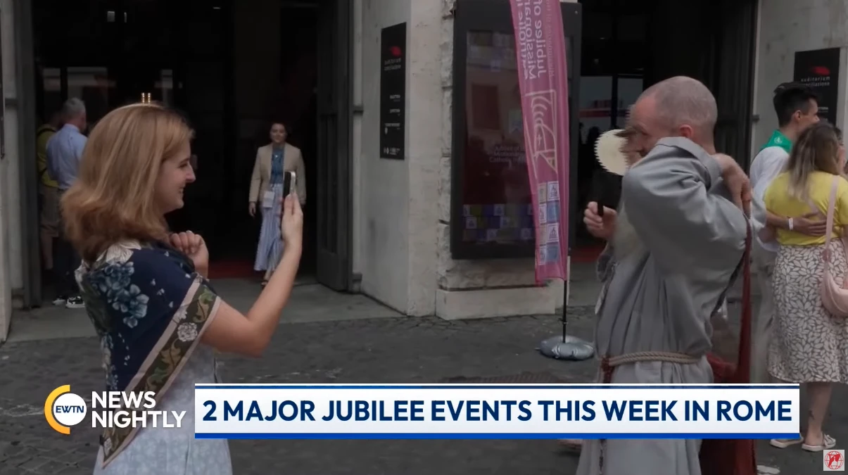 29 juli 2025 – Een deelnemer aan het jubeljaar maakt een foto van een mede jubeljaarganger in Rome tijdens een uitzending van “EWTN News Nightly,” maandag 28 juli 2025. Foto: “EWTN News Nightly”