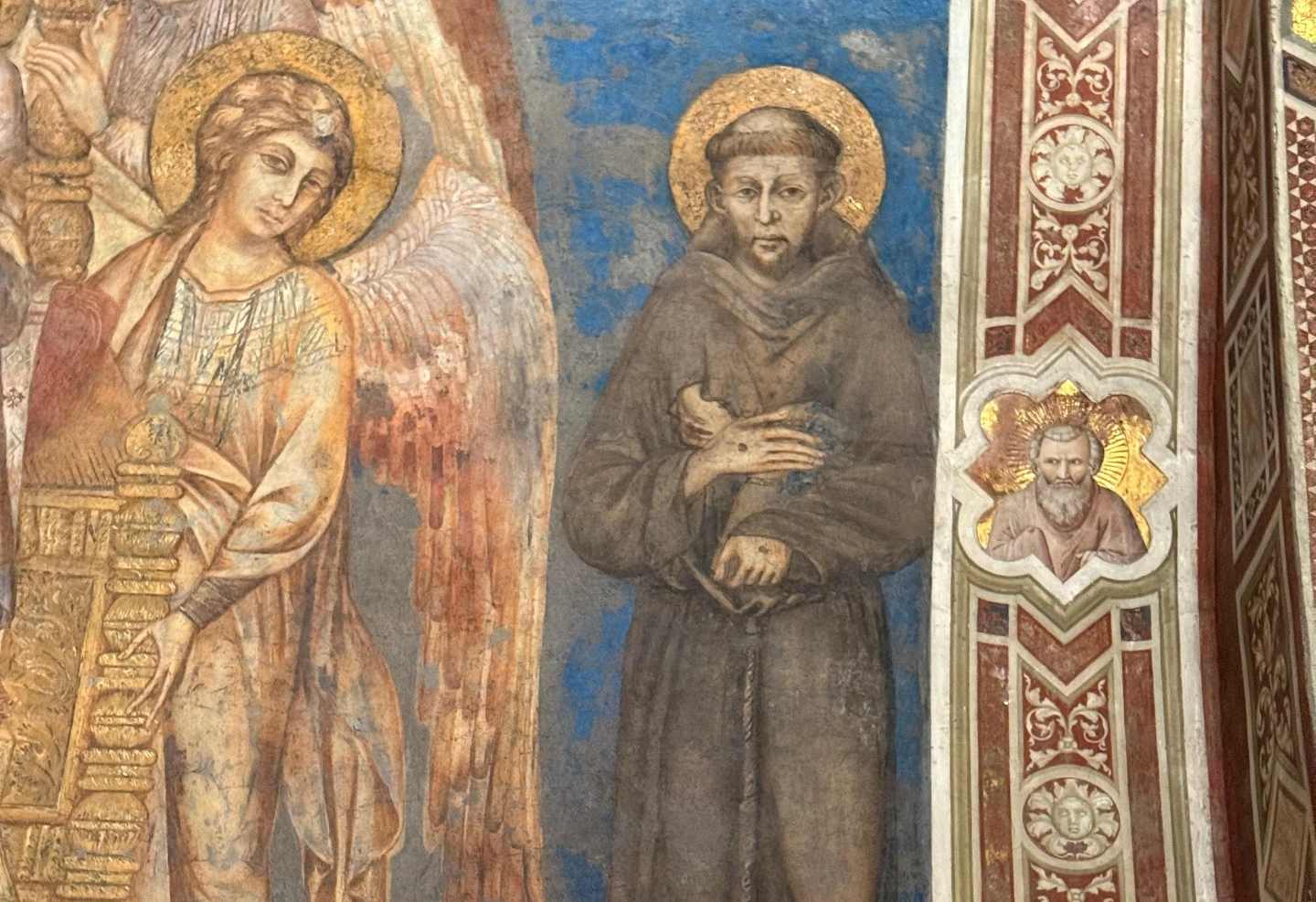 4 oktober 2025 – Een 13e-eeuwse fresco van Sint Franciscus van Assisi door de Florentijnse schilder Cimabue, een van de vroegste afbeeldingen van de heilige, bevindt zich in de benedenkerk van de Basiliek van Sint Franciscus van Assisi in Assisi, Italië. Foto: Jacob Stein/Crux Stationalis
