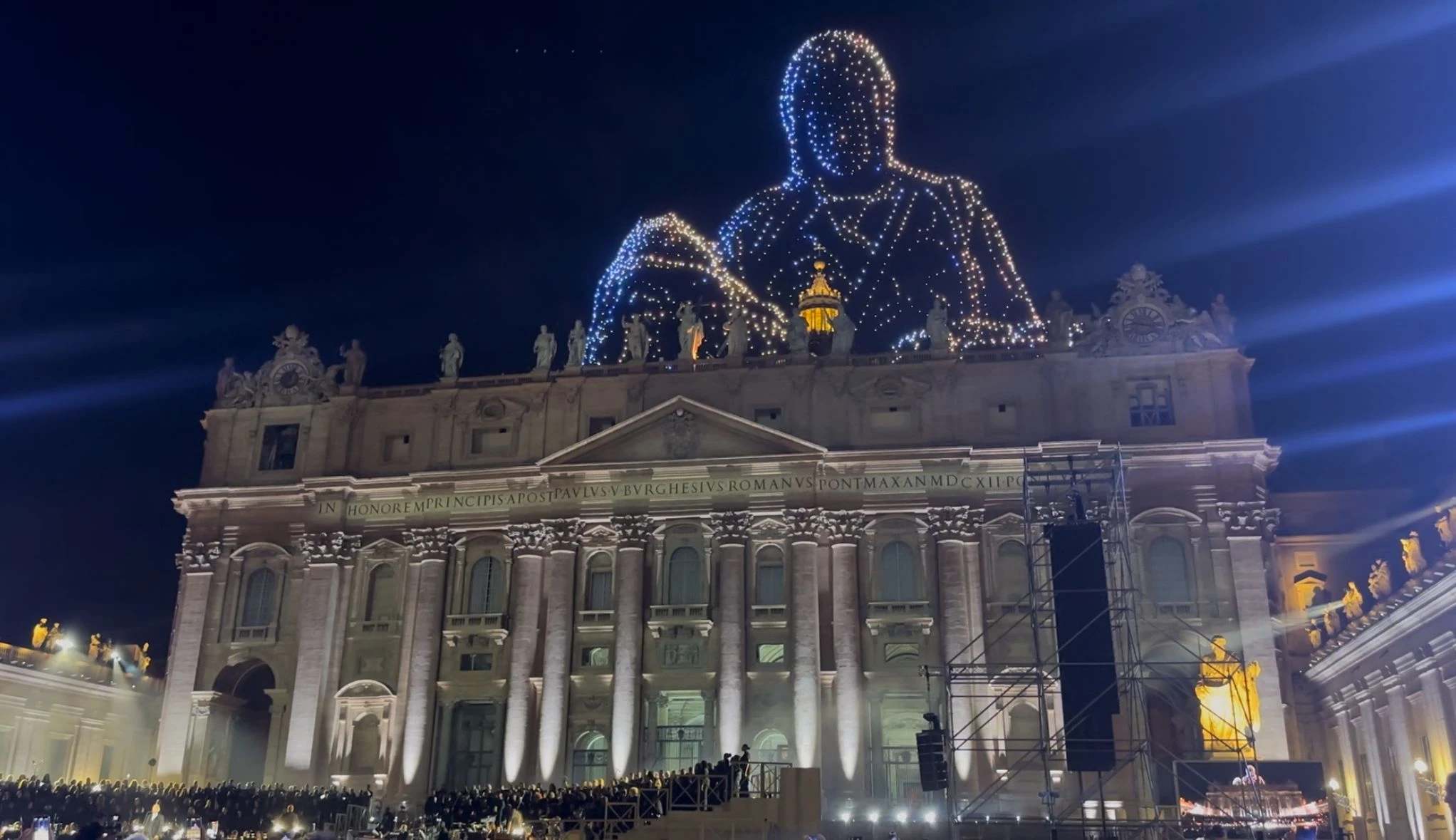 Het evenement begon met adembenemende symboliek: meer dan 3.000 drones verlichtten de nachtelijke lucht boven de basiliek, waarbij ze het beeld van paus Franciscus aftekenden en Michelangelo’s koepel en Bernini’s zuilengalerij in licht omlijnden. De voorstelling, een primeur voor het Vaticaan, zorgde eerst voor een plechtige stilte voordat het publiek in applaus uitbarstte.