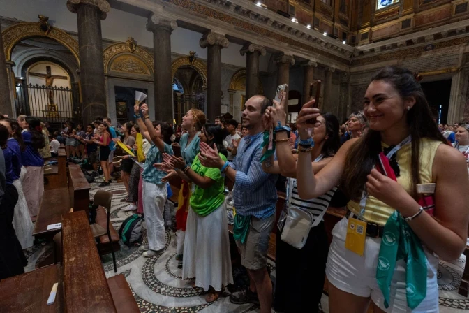 1 augustus 2025 – Jongeren laten hun stem horen vanuit de Basiliek van Santa Maria in Trastevere. Foto: Daniel Ibáñez/CNA