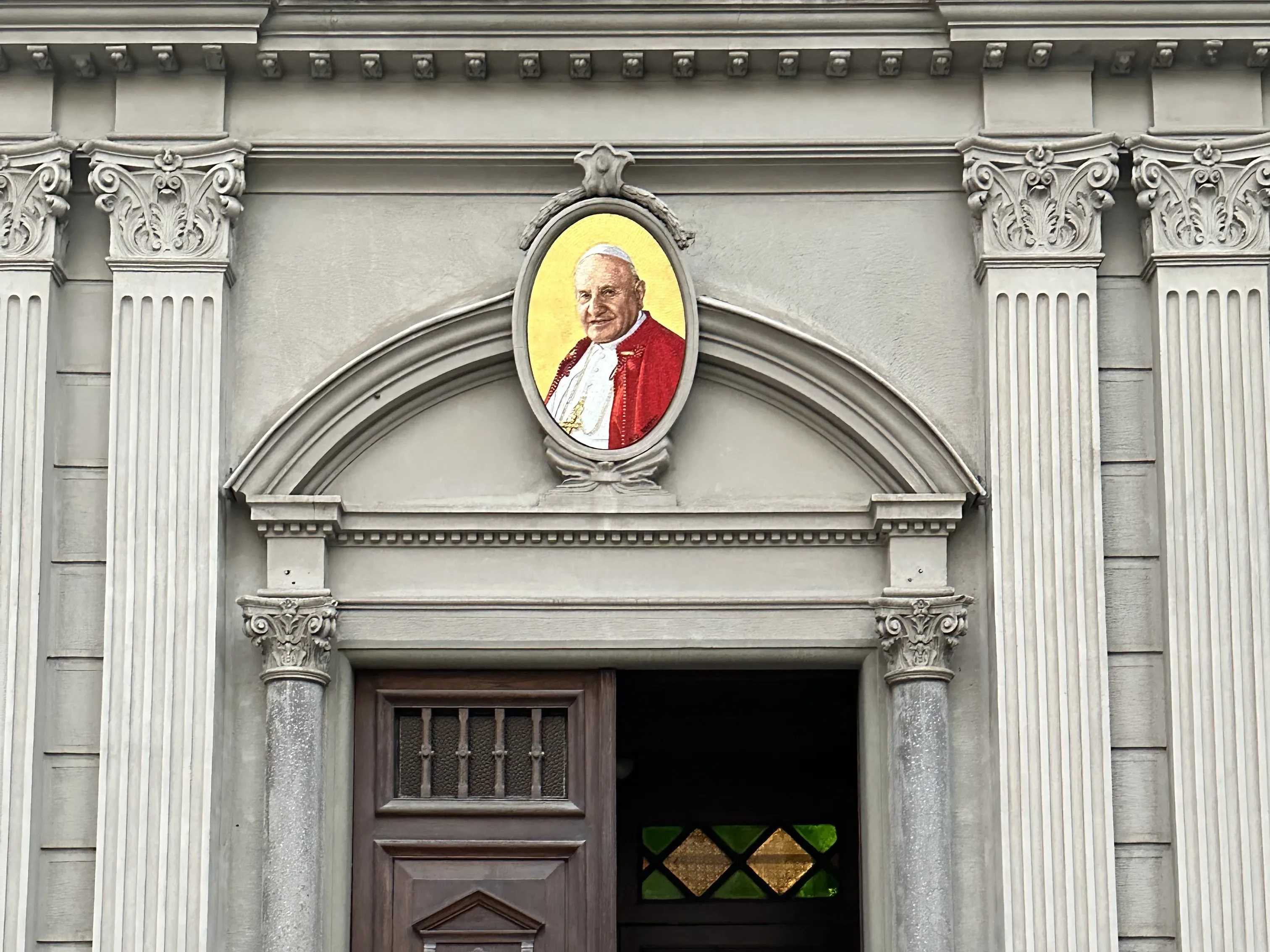 26 november 2025 – Afbeelding van St. Johannes XXIII boven de ingang van de Kathedraal van de Heilige Geest, Istanbul. Foto: Souhail Lawand / ACI MENA